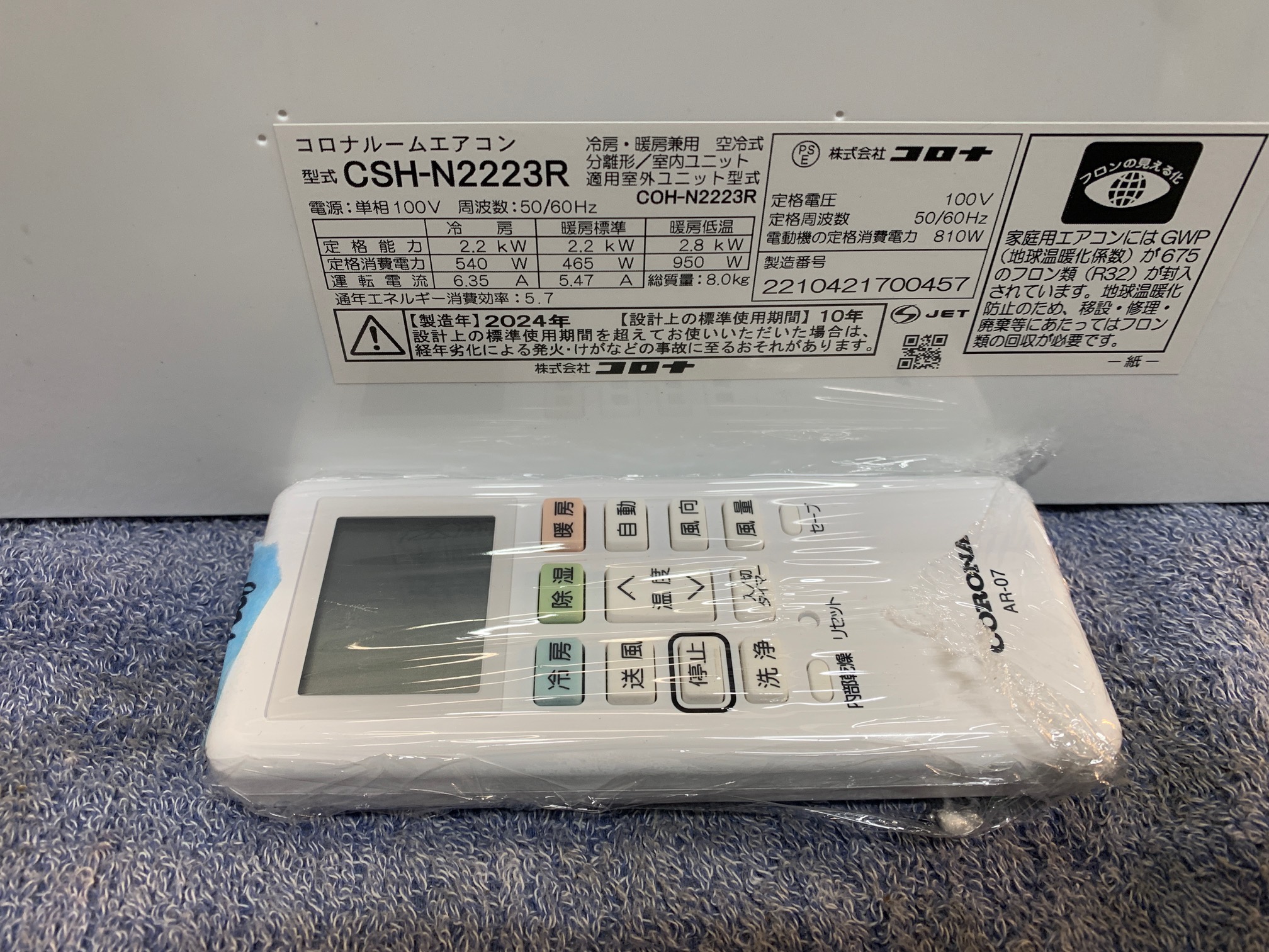 《売約》2.2KW冷暖エアコン 2024年製 コロナ CSH-N2223R☆使用歴浅(ED/NSMZ/SJM)