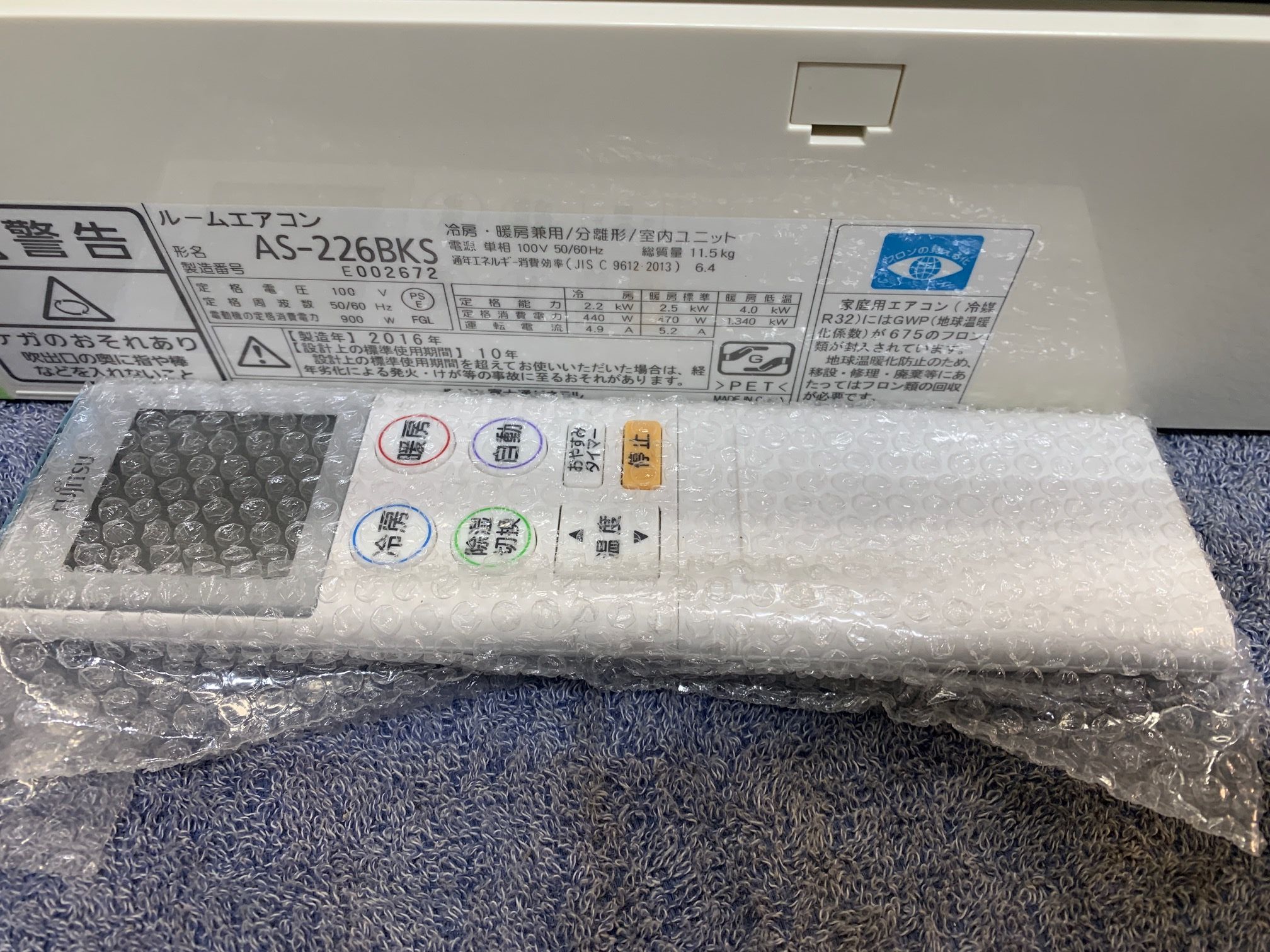 2.2KW冷暖エアコン 2016年製 富士通 34,000円(37,400円税込) AS-226BKS※全体的に色ヤケあり ☆自動フィルターお掃除機能 リモコン状態良好