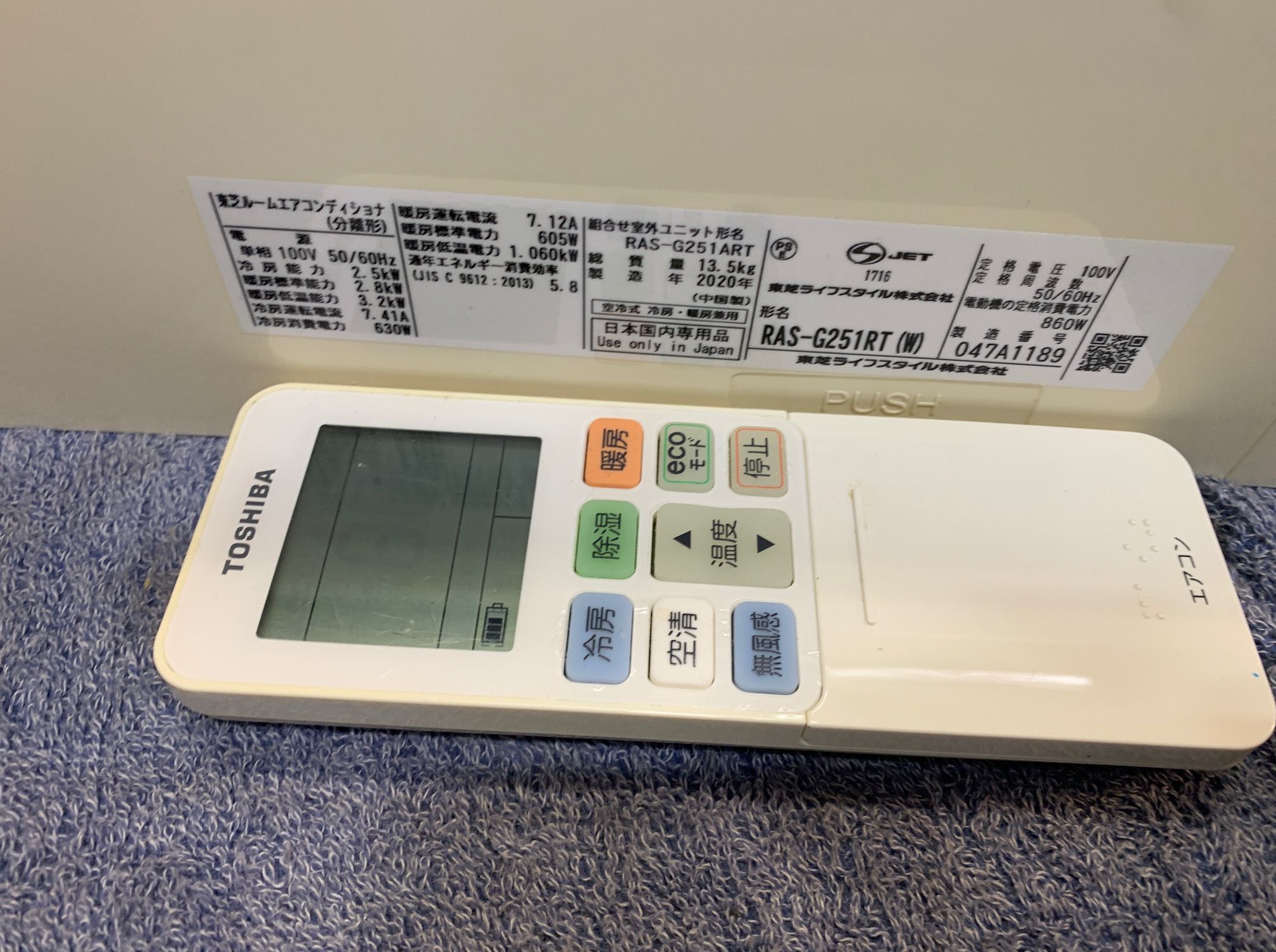 2.5KW冷暖エアコン 2020年製 東芝 42,000円(46,200円税込)RAS-G251RT※全体的に色ヤケあり☆自動フィルターお掃除機能