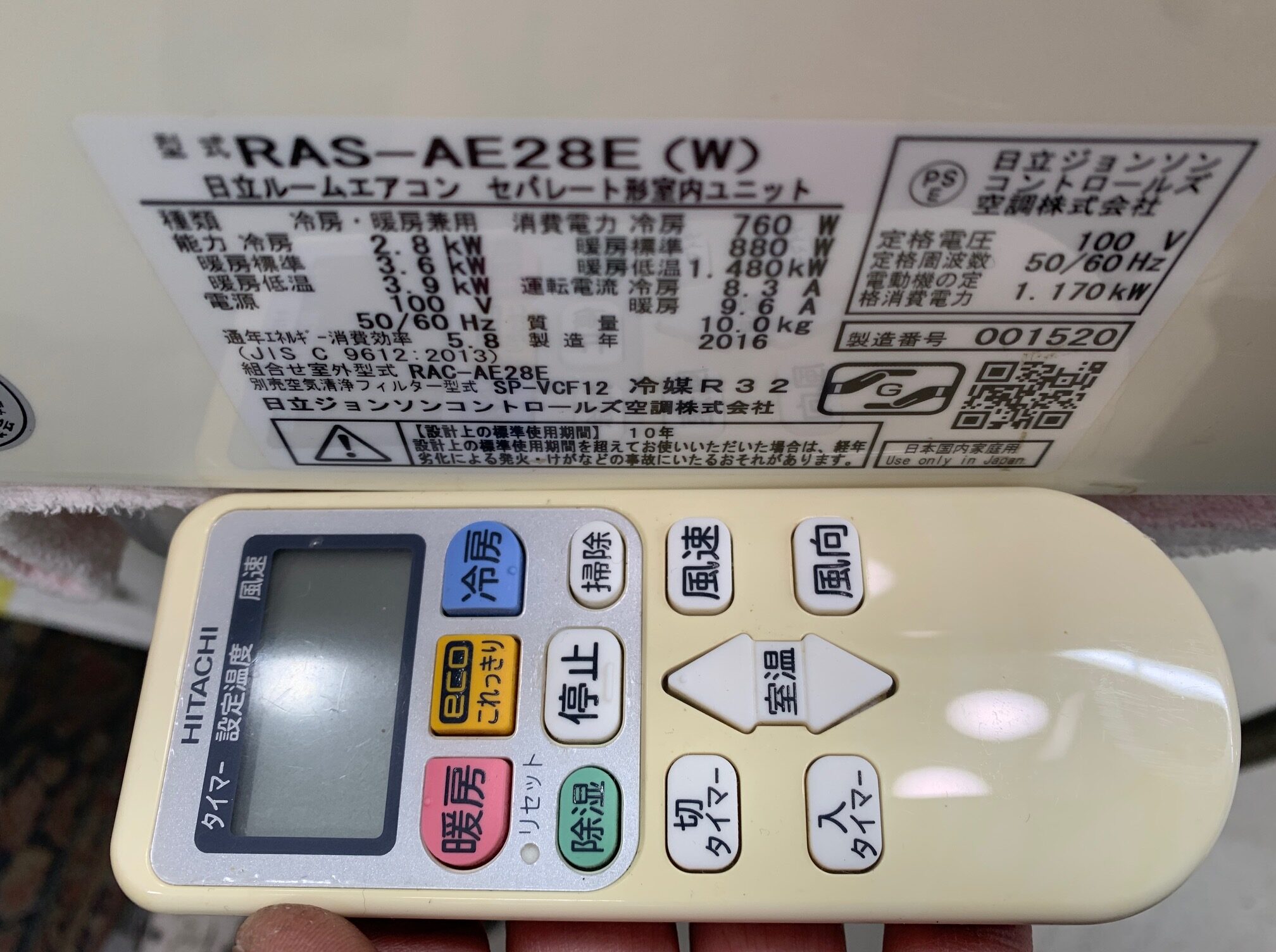 2.8KW冷暖エアコン 2016年製 日立 42,000円(46,200円税込)RAS-AE28E※全体的に色ヤケあり ☆自動フィルターお掃除機能 ステンレス白くまくん