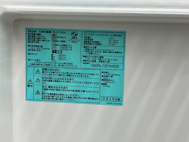 《売約》106L冷蔵庫 2015年製 ハイアール JR-N106K※冷凍室扉下ワレあり、天板小シミあり