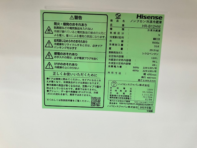 《売約》124L冷蔵庫 2023年製 ハイセンスHR-B12HW