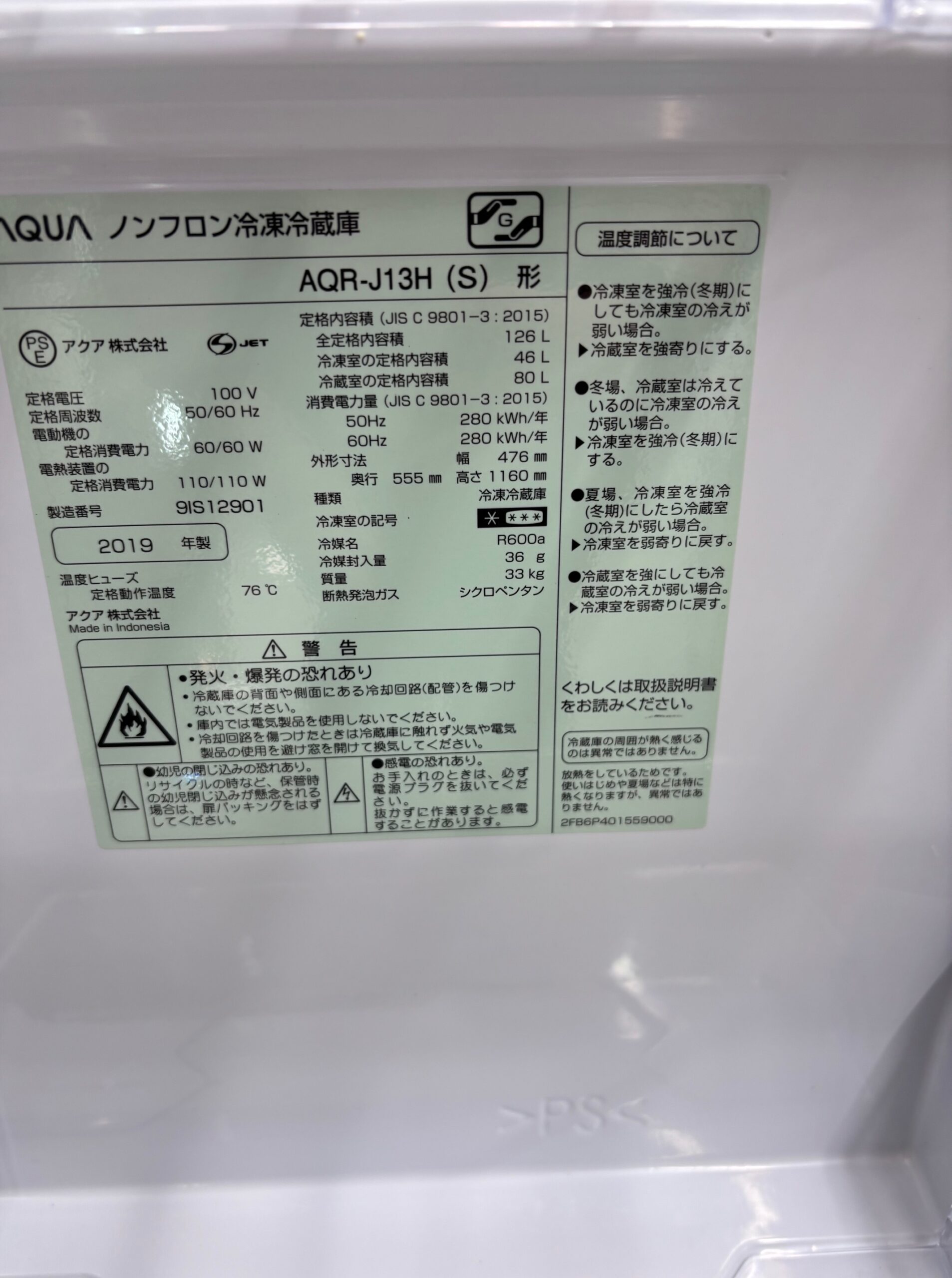 126L冷蔵庫 2019年製 アクア 14,000円(15,400円税込) AQR-J13H※前面ヘコミあり