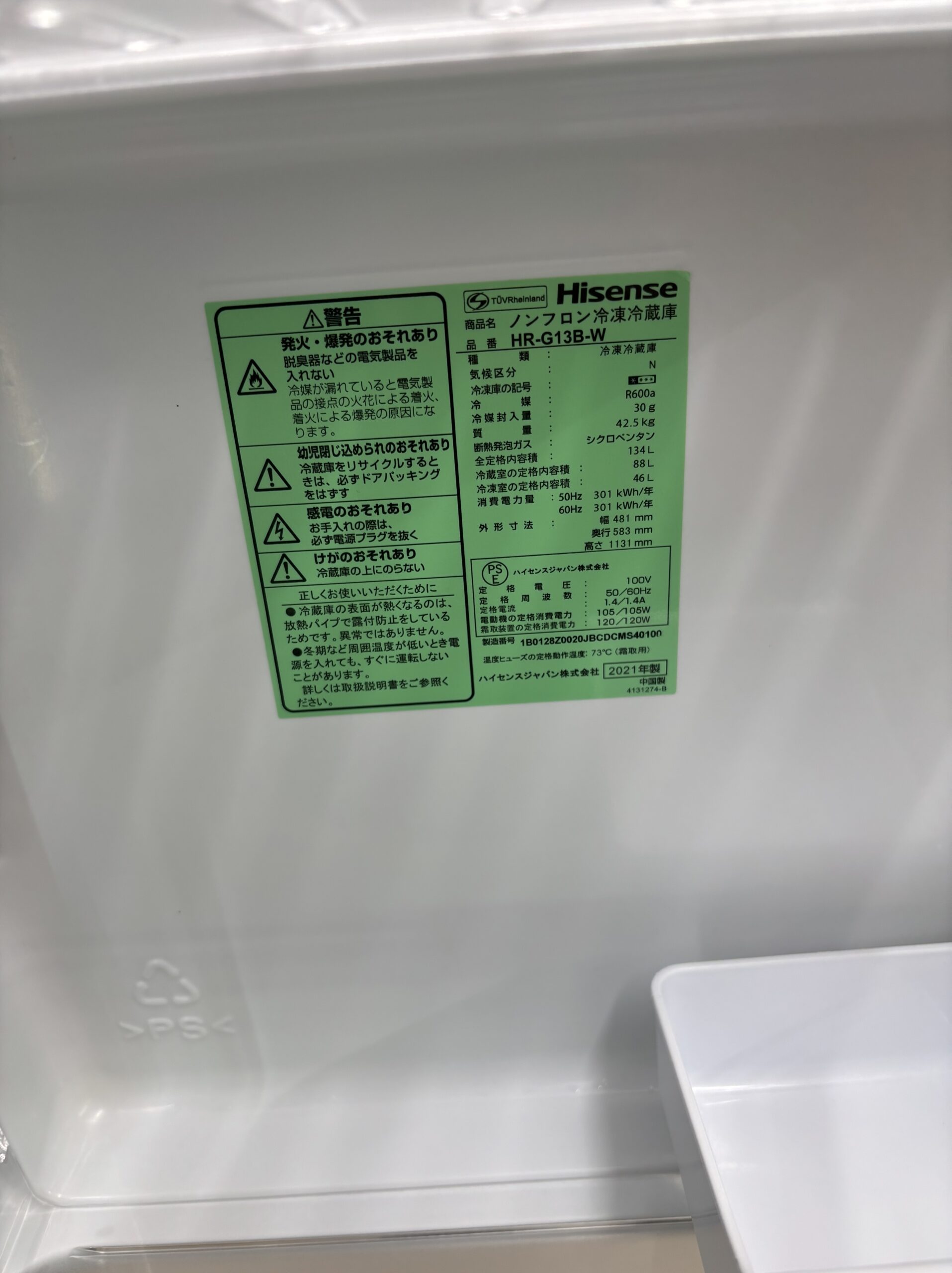 134L冷蔵庫 2021年製 ハイセンス19,000円(20,900円税込) HR-G13B