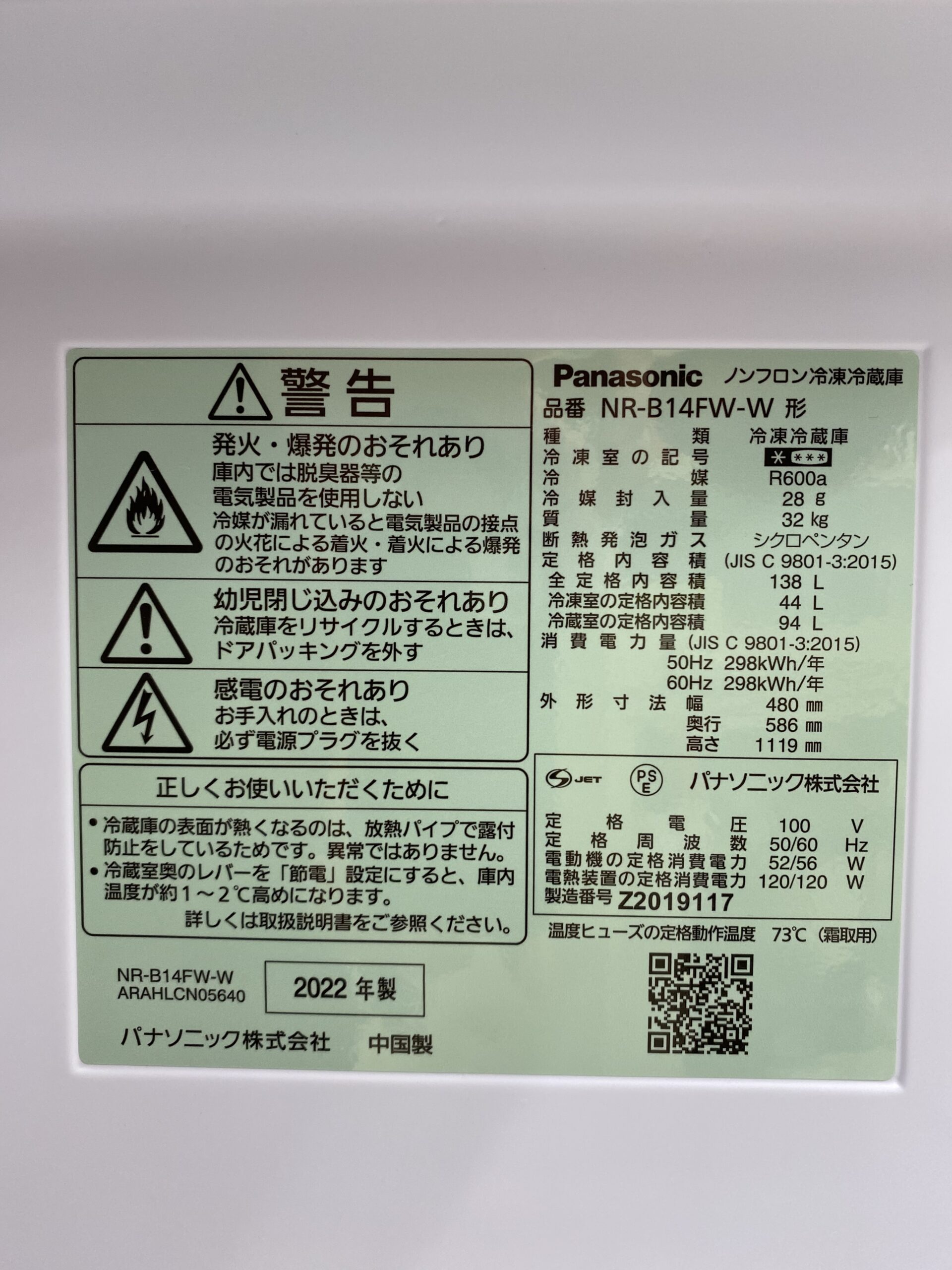 (立)138L冷蔵庫 2022年製 パナソニック 22,000円(24,200円税込)NR-B14FW☆状態良好