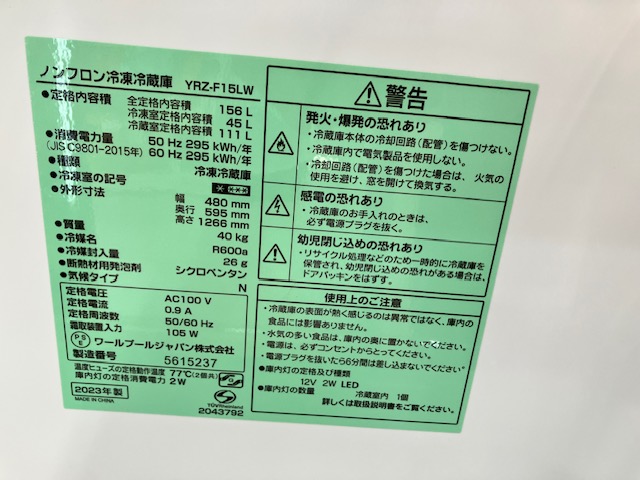 2025年10月30日 / 最終更新日 : 2026年2月3日 ec-republic 売約済み【完売】 《売約》156L冷蔵庫 2023年製 ヤマダ電機 YRZ-F48LW※小キズあり 【状態】B通常品※小キズあり ☆当店保証12か月付き リサイクルは1点もの。 ご来店お待ちしております♪ 商品のご予約・お問い合わせ 商品名(自動入力) お名前(ニックネーム可) (必須) メールアドレス (必須) お問い合わせ内容(配送希望の場合はお届け先の市区町村名、階数、エレベーターの有無もご記入下さい。) (必須)