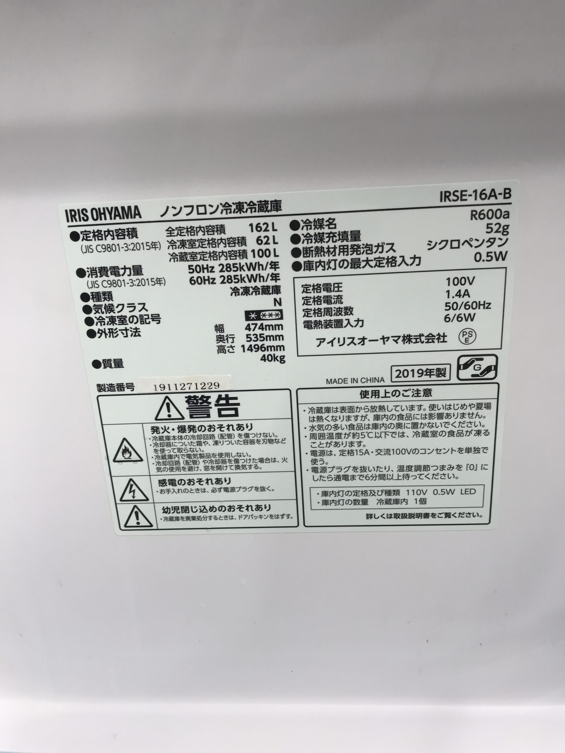 《売約》162L冷蔵庫 2019年製 アイリスオーヤマ IRSE-16A※全体的に使用感あり