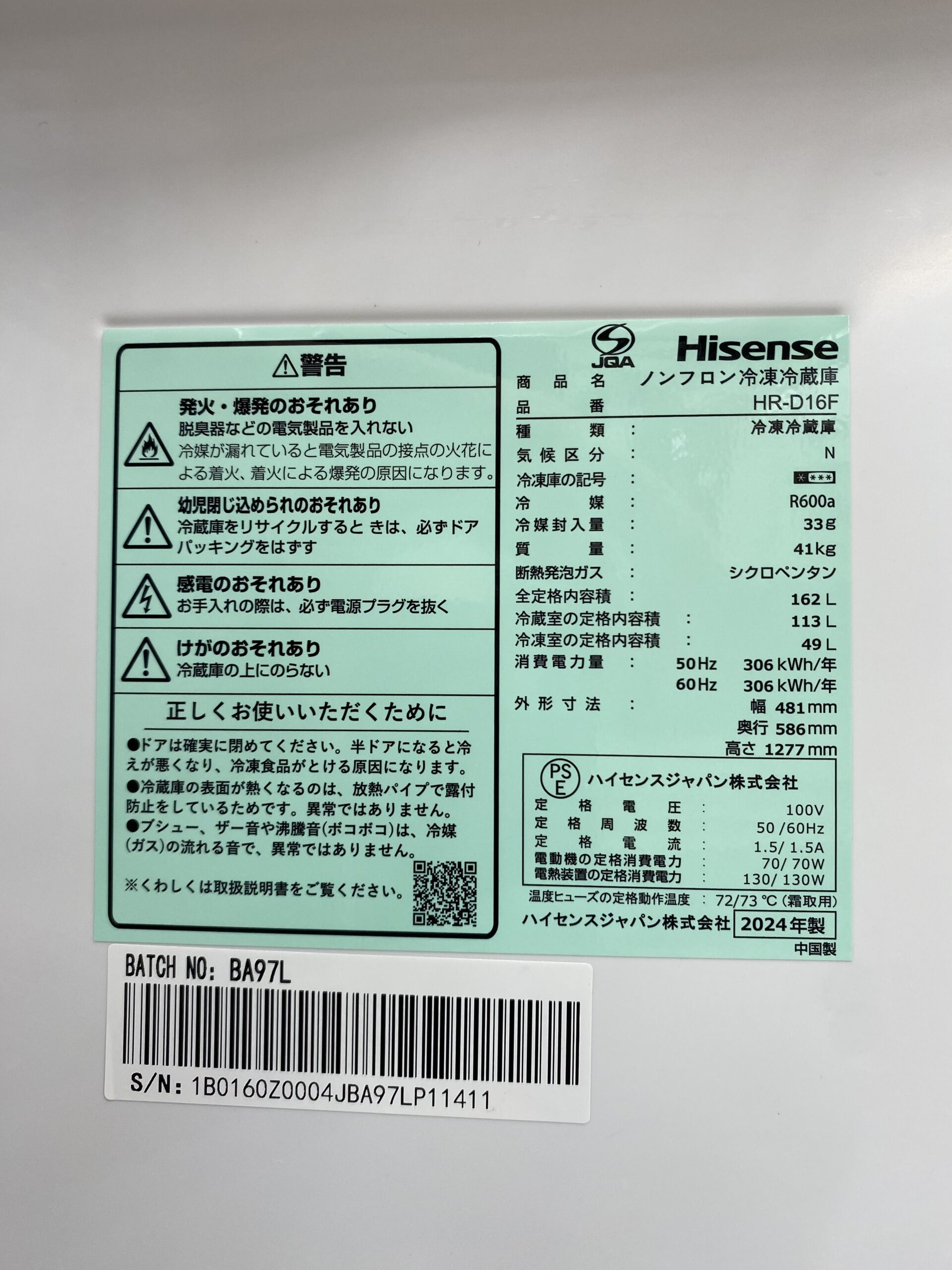 《売約》162L冷蔵庫 2024年製 ハイセンス HR-D16F※ヘコミあり