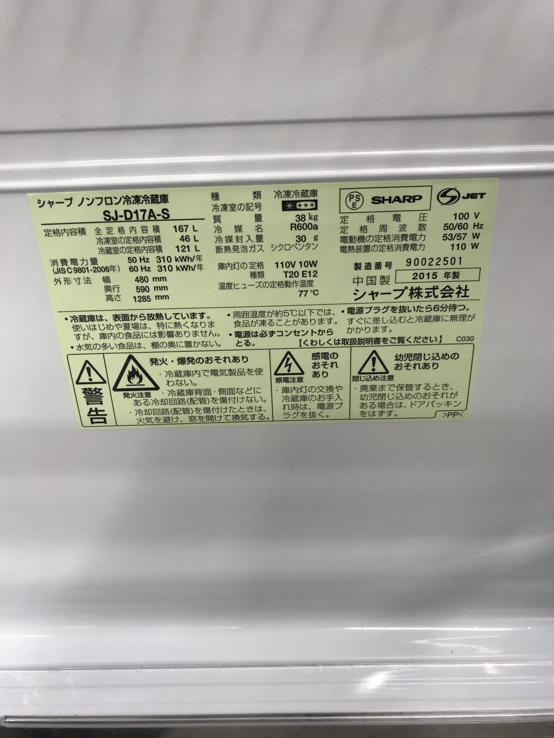 《売約》167L冷蔵庫 2015年製 シャープSJ-D17A※小キズ、側面キズあり