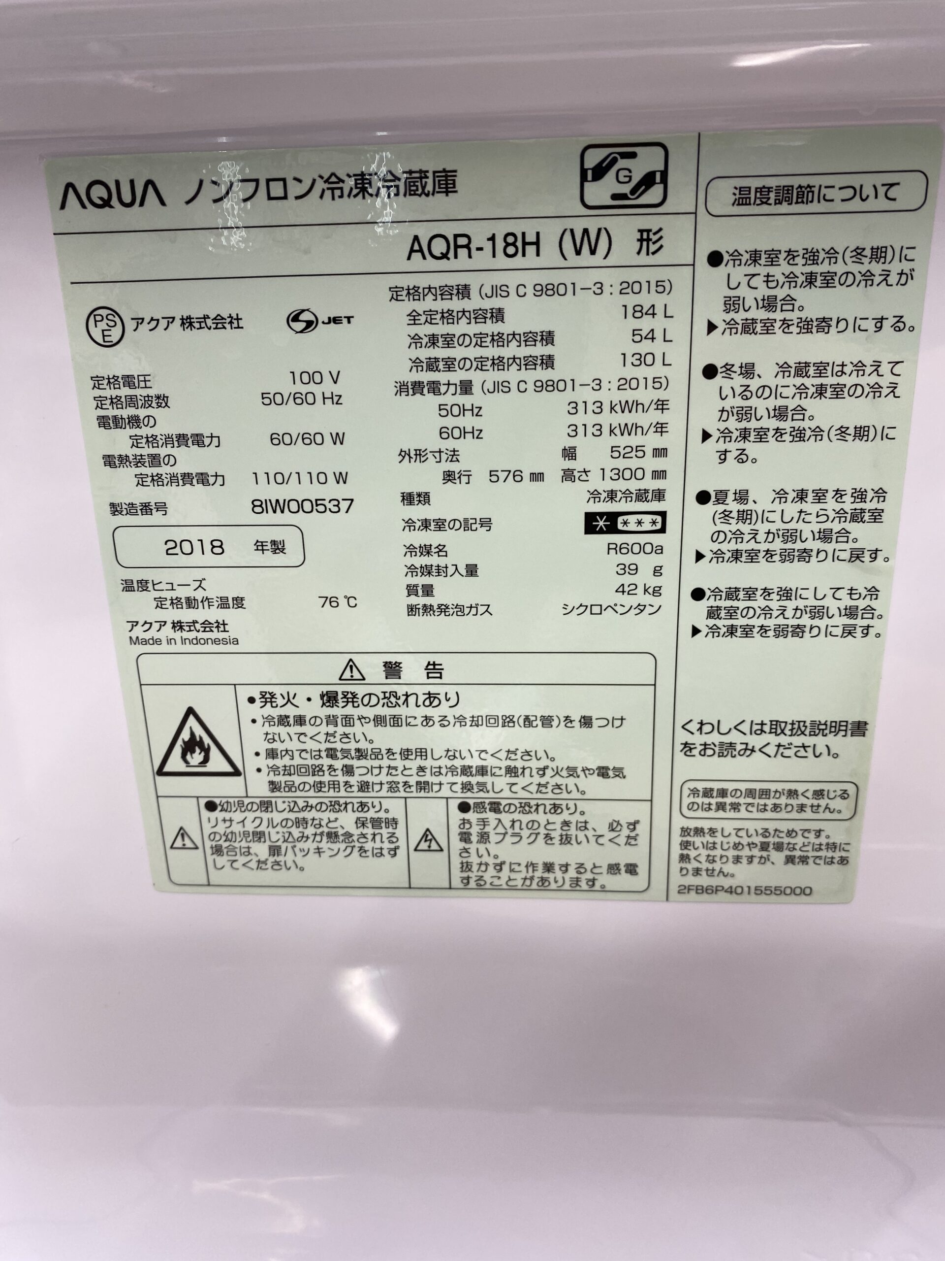 《売約》184L冷蔵庫 2018年製 アクア AQR-18H※色ヤケあり