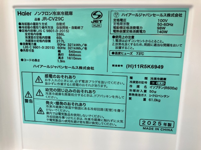 《売約》286L右開き冷蔵庫 2025年製 ハイアール JR-CV29C☆使用歴浅 ※小キズあり