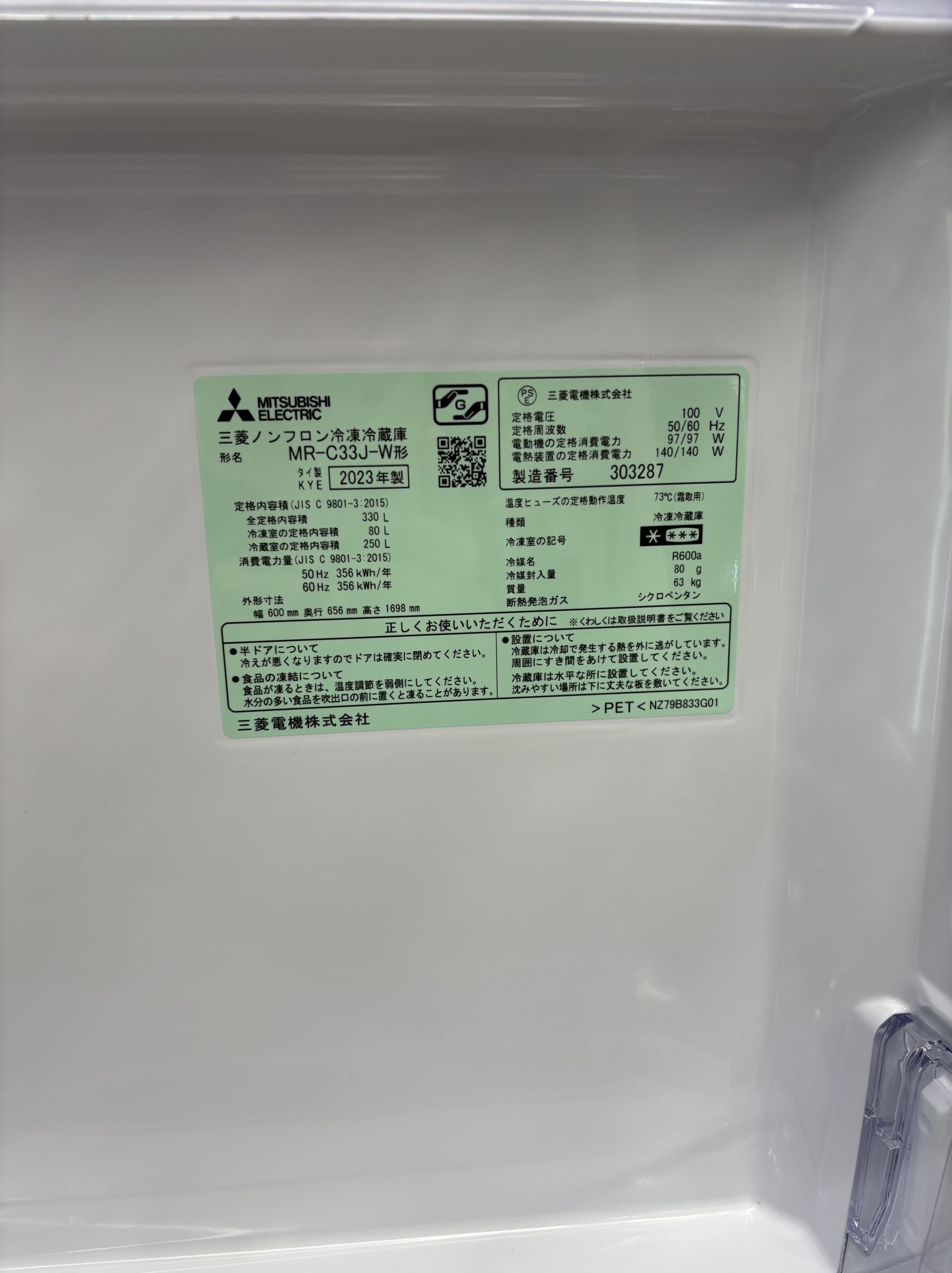 《売約》330L右開き冷蔵庫 2023年製 三菱電機 MR-C33※側面にキズあり☆自動製氷