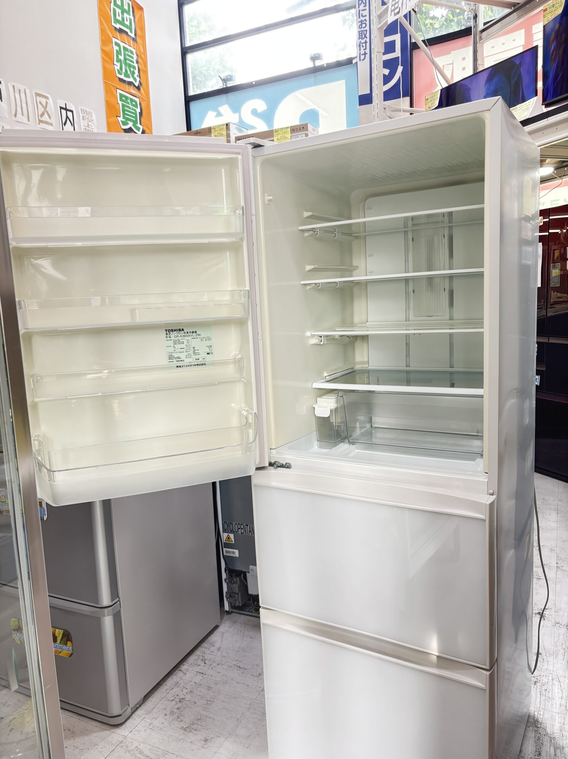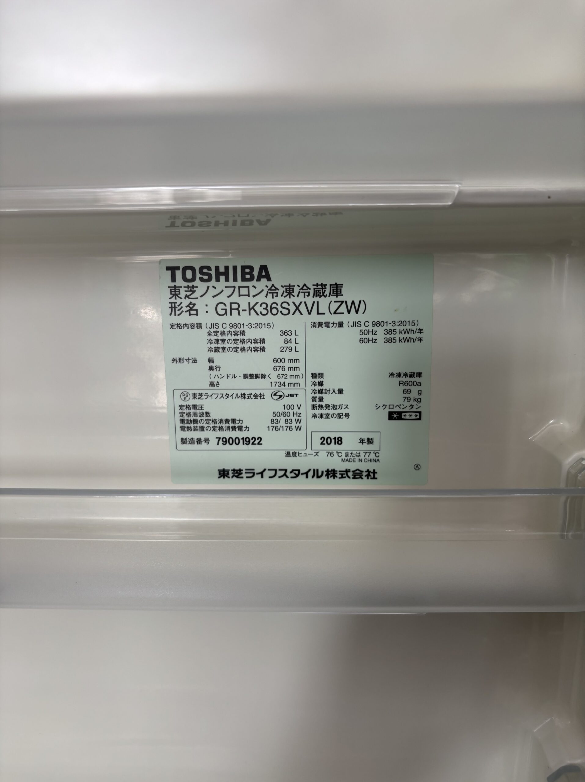 363L左開き冷蔵庫 2018年製 東芝 45,000円(49,500円税込)GR-K36SXVL※野菜室ケースシミ、小キズあり、仕切り板ヒビあり