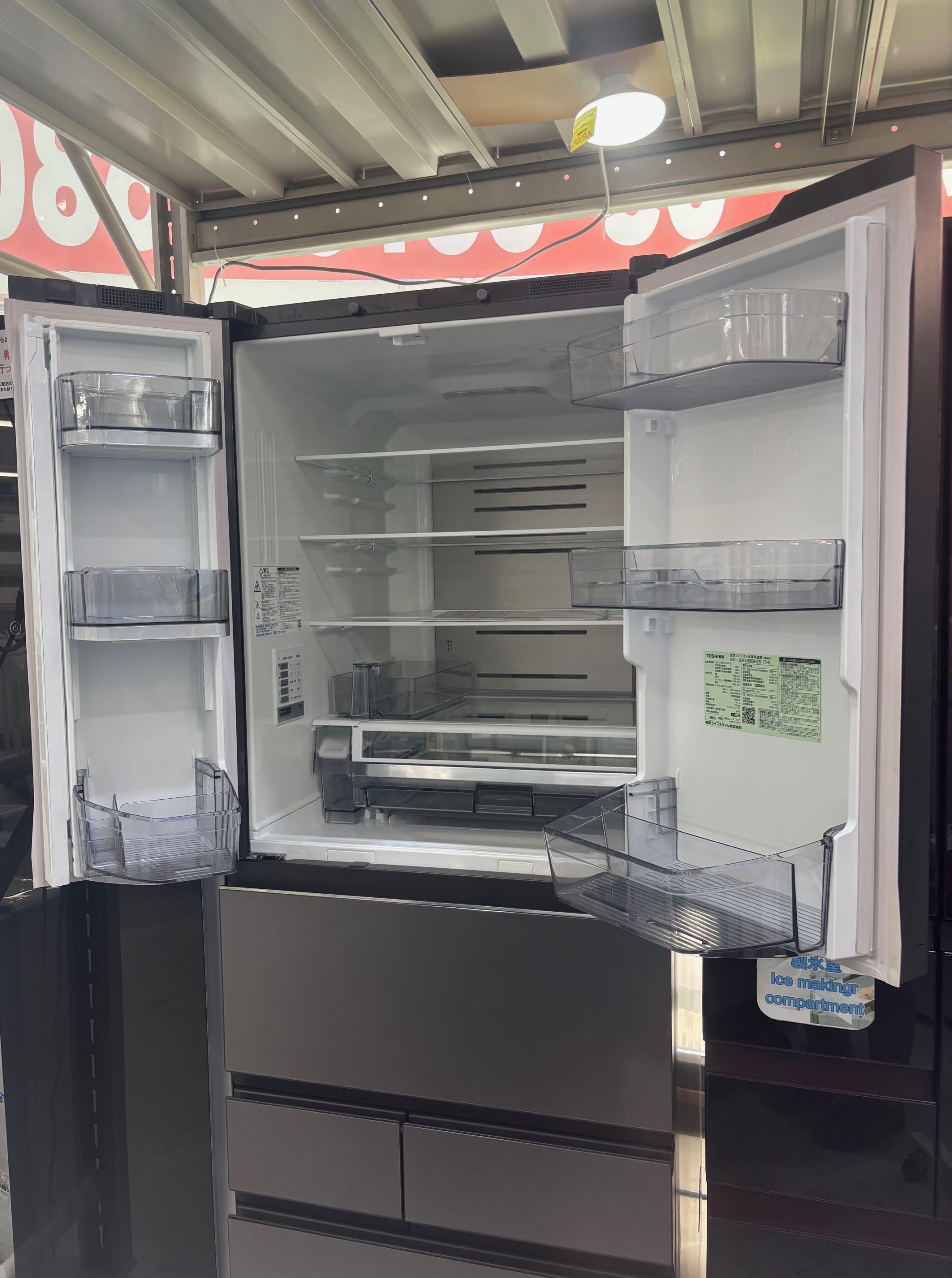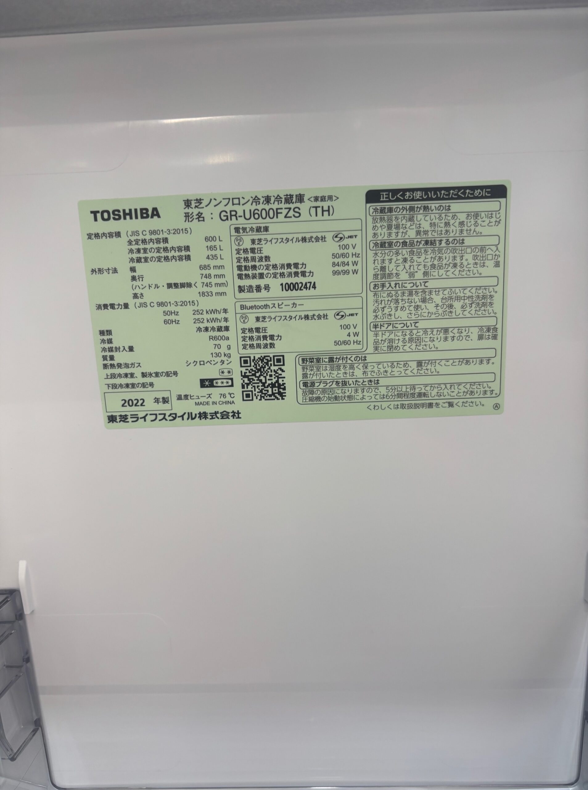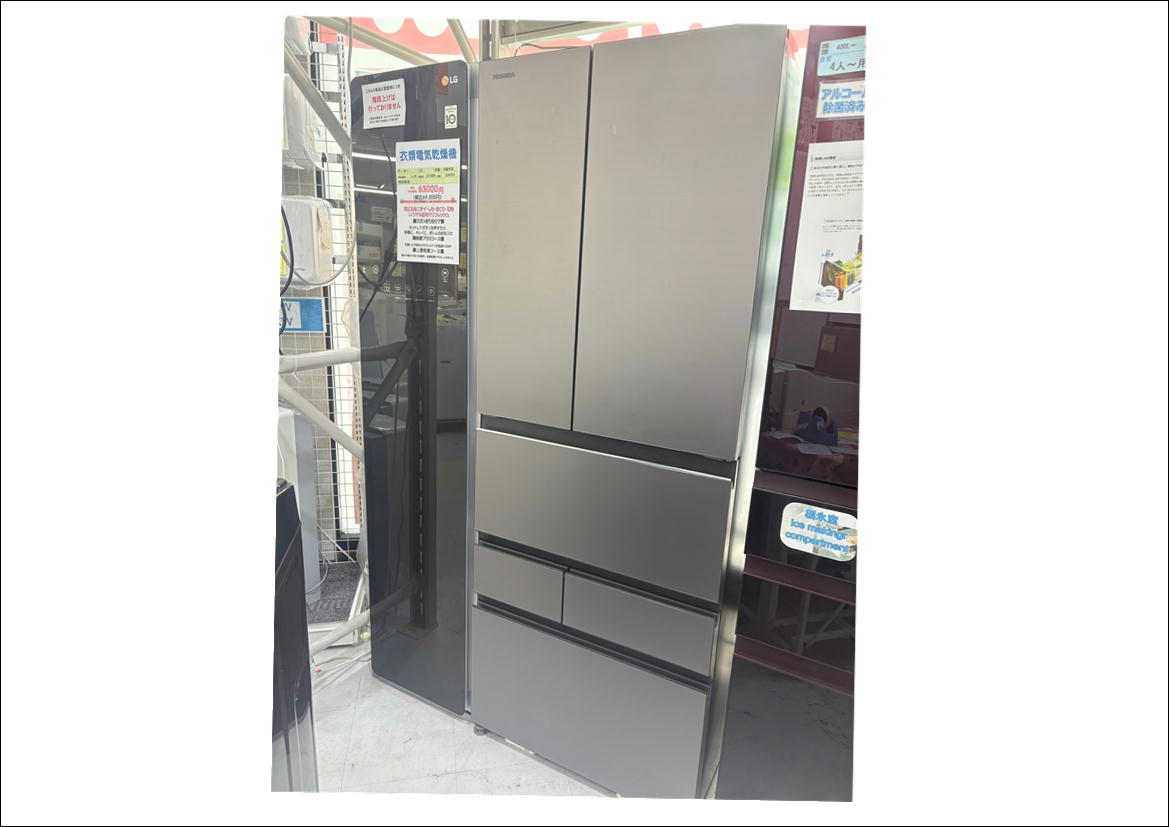 600Lフレンチ冷蔵庫 2022年製 東芝 82,000円(90,200円税込)GR-U600FZS※仕切り板にヒビ、小キズ、野菜室にシミあり