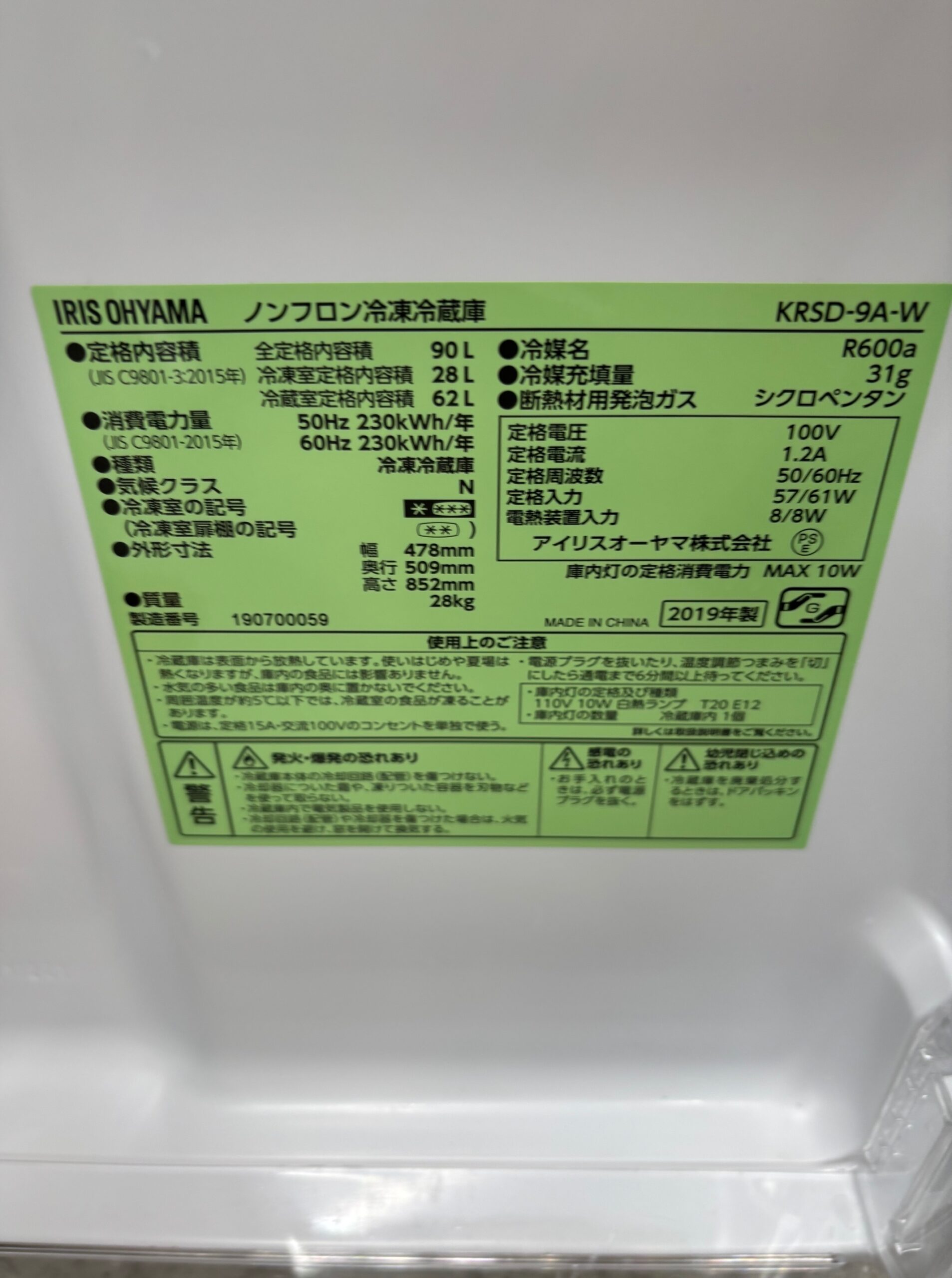 《売約》90L冷蔵庫 2019年製 アイリスオーヤマ KRSD-9A※色ヤケ・小キズあり
